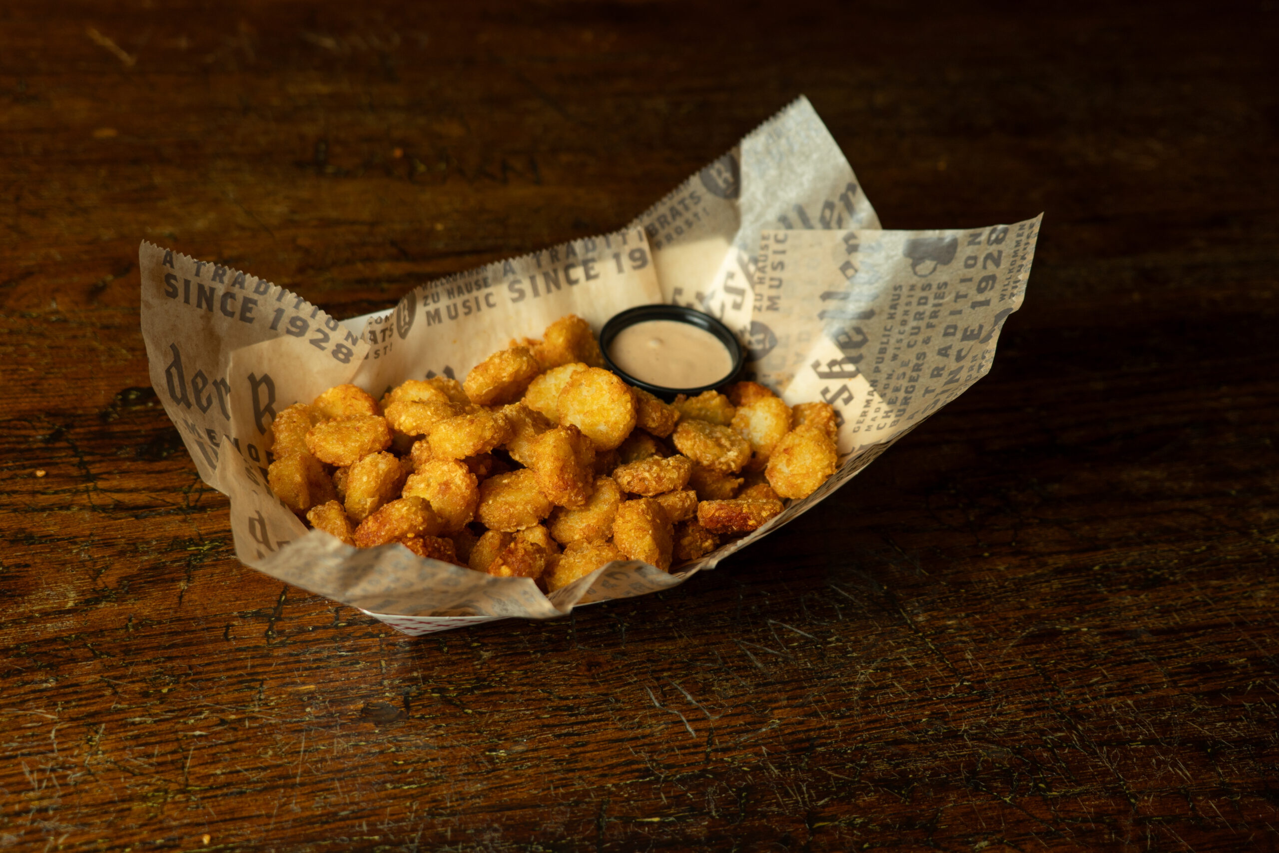 The beer battered tater tots are an amazing way to get you in the mood for March Madness. You could get a large serving to share with a group of friends, or keep it to yourself. Treat yourself! Offered in both a small and large serving, the tater tots paired with your choice of dipping sauce is a recipe for game watch greatness.
